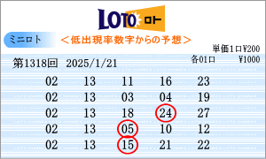 | 1月21日第1318回。運命数は「4」・「2」の2つ。該当数字は、「04」・「14」・「24」・「02」・「12」・「22」です。チャートから見た今回の注意数字は、「02」・「04」・「07」・「12」・「13」・「21」・「23」・「24」・「30」・「31」。1318回の軸数字は候補は「14」・「24」・「12」。この中から「12」・「24」を選びました。465組の組み合わせの中では過去44回出現で中位の組み合わせです。買い目はミニロトパーフェクトデータの最新相性数字からの5組の買い目です。 |