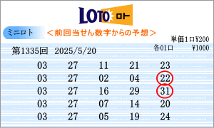 | 5月20日第1335回を狙う予測数字は、斜線成立数字と出現間隔の中から、「02」・「03」・「04」・「07」・「09」・「11」・「13」・「16」・「19」・「20」・「22」・「23」・「25」・「27」・「28」となりました。1334回からの連続数字は、「03」と「27」を軸数字に。高確率数字は「11」と「25」を軸数字に。低確率数字は、「09」と「28」を軸数字に選びました。それぞれ5口の買い目はミニロトパーフェクトデータからの相性数字で組み立てました。同じ段数での斜線交差数字は「06」、ボーナス数字同士の斜線数字は「25」です。 |