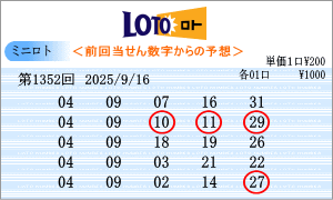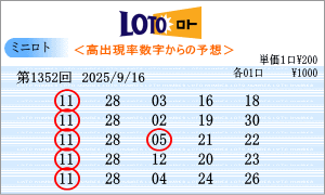 9月16日第1352回を狙う予測数字は、斜線成立数字と出現間隔の中から、「02」・「03」・「04」・「05」・「08」・「09」・「11」・「12」・「14」・「18」・「20」・「22」・「24」・「28」・「30」となりました。1351回からの連続数字は、「04」と「09」を軸数字に。高確率数字は、「11」と「28」を軸数字に。低確率数字は、「02」と「30」を軸数字に選びました。それぞれ5口の買い目はミニロトパーフェクトデータからの相性数字で組み立てました。同じ段数での斜線交差数字は「13」、ボーナス数字同士の斜線数字は「17」です。 |