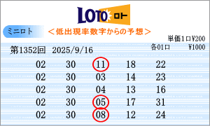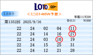 9月16日第1352回。運命数は「2」・「4」の2つ。該当数字は、「02」・「12」・「22」・「04」・「14」・「24」の6個です。チャートから見た今回の注意数字は、「02」・「04」・「09」・「11」・「12」・「14」・「22」・「24」・「28」・「30」。1352回の軸候補数字は「22」・「24」を選びました。465組の組み合わせの中では過去44回出現で中位の組み合わせです。買い目はミニロトパーフェクトデータの最新相性数字からの5組の買い目です。 |