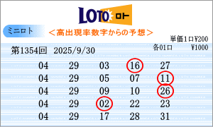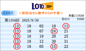 9月30日第1354回を狙う予測数字は、斜線成立数字と出現間隔の中から、「02」・「03」・「04」・「07」・「10」・「12」・「13」・「15」・「17」・「18」・「19」・「22」・「25」・「27」・「29」となりました。1353回からの連続数字は、「13」と「18」を軸数字に。高確率数字は、「04」と「29」を軸数字に。低確率数字は、「03」と「07」を軸数字に選びました。それぞれ5口の買い目はミニロトパーフェクトデータからの相性数字で組み立てました。同じ段数での斜線交差数字は「01」。ボーナス数字同士の斜線数字は「04」・「25」。 |