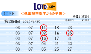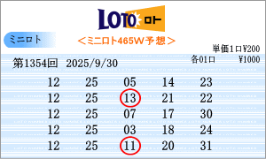 9月30日第1354回。運命数は「2」・「5」の2つ。該当数字は、「02」・「12」・「22」・「05」・「15」・「25」の6個です。チャートから見た今回の注意数字は、「02」・「04」・「07」・「12」・「15」・「18」・「22」・「25」・「27」・「29」。1354回の軸候補数字は「12」・「25」を選びました。465組の組み合わせの中では過去39回出現で下位の組み合わせです。買い目はミニロトパーフェクトデータの最新相性数字からの5組の買い目です。 |