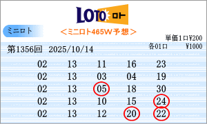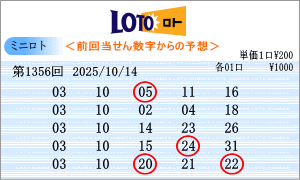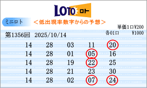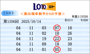 10月14日第1356回を狙う予測数字は、斜線成立数字と出現間隔の中から、「02」・「03」・「04」・「05」・「07」・「09」・「10」・「11」・「14」・「17」・「20」・「22」・「24」・「26」・「28」となりました。1355回からの連続数字は、「03」と「10」を軸数字に。高確率数字は、「04」と「11」を軸数字に。低確率数字は、「14」と「28」を軸数字に選びました。それぞれ5口の買い目はミニロトパーフェクトデータからの相性数字で組み立てました。同じ段数での斜線交差数字は「08」・「13」、ボーナス数字同士の斜線数字は「31」。 |