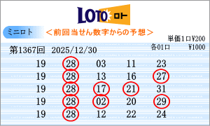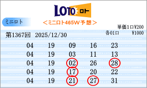 | 12月30日第1367回を狙う予測数字は、斜線成立数字と出現間隔の中から、「02」・「04」・「09」・「11」・「14」・「16」・「18」・「19」・「22」・「24」・「25」・「27」・「28」・「29」・「31」となりました。1366回からの連続数字は、「19」と「28」を軸数字に。高確率数字は、「16」と「25」を軸数字に。低確率数字は、「18」と「22」を軸数字に選びました。それぞれ5口の買い目はミニロトパーフェクトデータからの相性数字で組み立てました。同じ段数での斜線交差数字、ボーナス数字同士の斜線数字はありません。2025年ラストの抽せん回となりました。2026年は1月6日です。 |