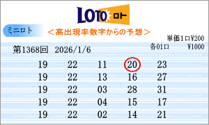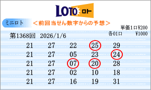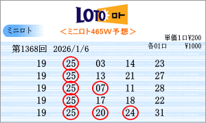 | 2026年1月6日第1368回。運命数は「5」・「9」の2つ。該当数字は、「05」・「15」・「25」・「09」・「19」・「29」です。チャートから見た今回の注意数字は、「01」・「05」・「09」・「15」・「19」・「21」・「22」・「25」・「26」・「29」。1368回の軸数字は「19」・「25」を選びました。465組の組み合わせの中では過去42回の出現で中位の組み合わせです。買い目はミニロトパーフェクトデータの最新相性数字からの5組の買い目です。 |