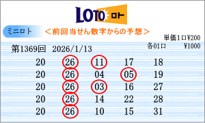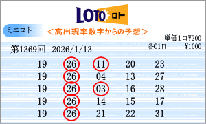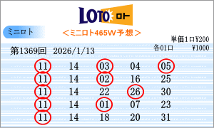 | 2026年1月13日第1369回。運命数は「1」・「2」・「4」の3つ。該当数字は、「01・「11・「21」・「31」・「02」・「12」「22」・「04」・「14」・「24」です。チャートから見た今回の注意数字は、「04」・「09」・「11」・「12」・「14」・「19」・「20」・「21」・「22」・「24」。1369回の軸数字は「11」・「14」を選びました。465組の組み合わせの中では過去50回の出現で上位の組み合わせです。買い目はミニロトパーフェクトデータの最新相性数字からの5組の買い目です。 |