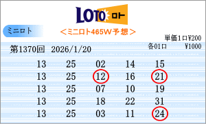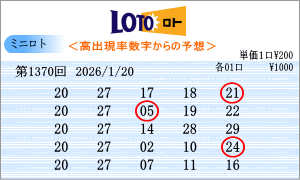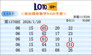 | 1月20日第1370回。運命数は「3」・「5」の2つ。該当数字は、「03」・「13」・「23」・「05」・「15」・「25」です。チャートから見た今回の注意数字は、「03」・「05」・「06」・「11」・「13」・「15」・「20」・「23」・「25」・「27」。1370回の軸数字は「13」・「25」を選びました。465組の組み合わせの中では過去47回の出現で上位の組み合わせです。買い目はミニロトパーフェクトデータの最新相性数字からの5組の買い目です。 |