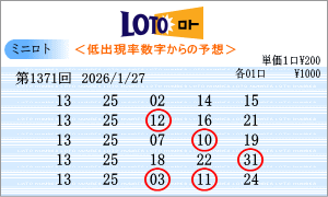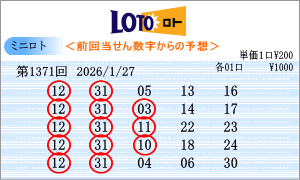 | 1月27日第1371回を狙う予測数字は、斜線成立数字と出現間隔の中から、「02」・「04」・「06」・「08」・「11」・「12」・「13」・「16」・「17」・「18」・「20」・「23」・「25」・「30」・「31」となりました。1370回からの連続数字は、「12」と「31」を軸数字に。高確率数字は、「02」と「20」を軸数字に。低確率数字は、「13」と「25」を軸数字に選びました。それぞれ5口の買い目はミニロトパーフェクトデータからの相性数字で組み立てました。同じ段数での斜線交差数字は「03」・「08」、ボーナス数字同士の斜線数字は「18」。 |