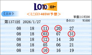| 1月27日第1371回。運命数は「1」・「6」・「8」の3つ。該当数字は、「01」・「11」・「21」・「31」・「06」・「16」・「26」・「08」・「18」・「28」です。チャートから見た今回の注意数字は、「02」・「06」・「08」・「11」・「12」・「16」・「18」・「20」・「26」・「28」。1371回の軸数字は「08」・「18」を選びました。465組の組み合わせの中では過去42回の出現で中位の組み合わせです。買い目はミニロトパーフェクトデータの最新相性数字からの5組の買い目です。 |