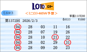 | 2月3日第1372回。運命数は「4」・「8」の2つ。該当数字は、「04」・「14」・「24」・「08」・「18」・「28」です。チャートから見た今回の注意数字は、「04」・「08」・「09」・「10」・「18」・「19」・「20」・「24」・「26」・「28」。1372回の軸数字は「04」・「28」を選びました。465組の組み合わせの中では過去41回の出現で中位の組み合わせです。買い目はミニロトパーフェクトデータの最新相性数字からの5組の買い目です。 |