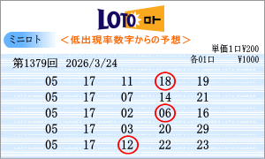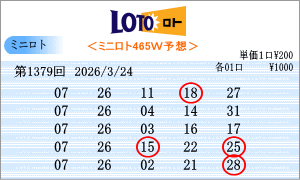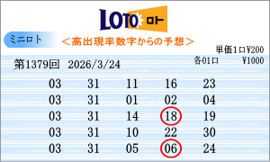 | 3月24日第1379回。運命数は「6」・「7」の2つ。該当数字は、「06」・「16」・「26」・「07」・「17」・「27」です。チャートから見た今回の注意数字は、「03」・「05」・「06」・「07」・「16」・「17」・「26」・「27」・「29」・「31」。この中から1379回の軸数字は「07」・「26」を選びました。465組の組み合わせの中では過去43回出現で中位の組み合わせです。買い目はミニロトパーフェクトデータの最新相性数字からの5組の買い目です。 |